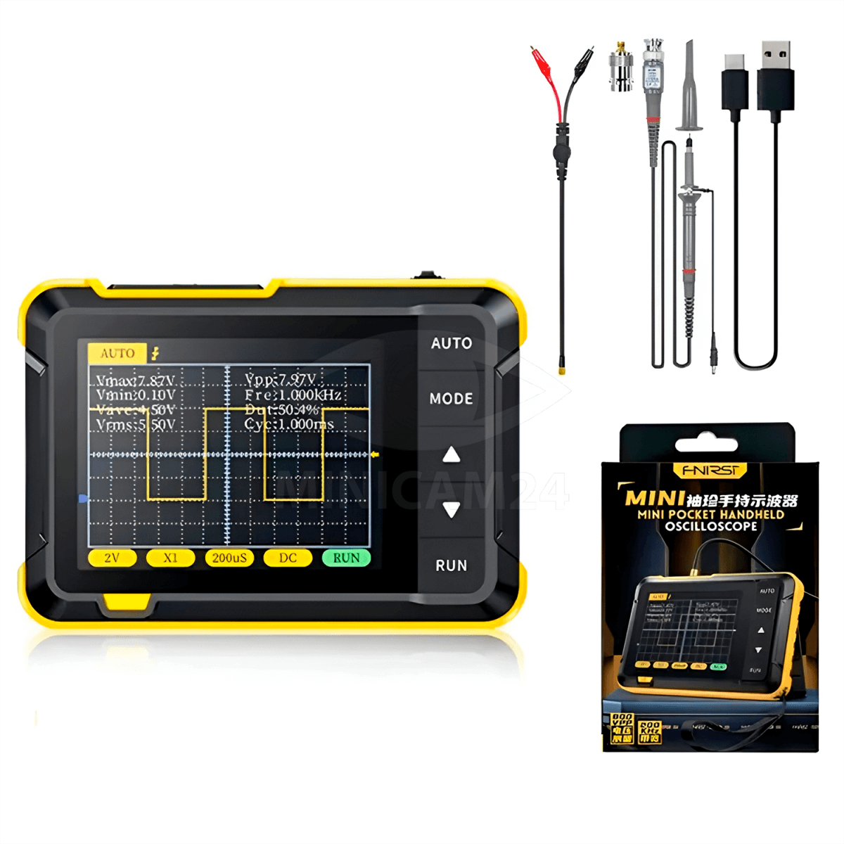 Этот цифровой осциллограф имеет компактные размеры, цветной дисплей 2,8 дюйма, частоту дискретизации в реальном времени 2,5 МС/с, полосу пропускания 200 кГц, полный набор функций запуска (одиночный, нормальный, автоматический), как для периодических аналоговых сигналов, так и для нерегулярных. можно свободно использовать периодические цифровые сигналы, поддерживать переключение между режимом запуска по переднему фронту и режиму запуска по заднему фронту, поддерживать измерение сигнала напряжения до ±400 В.